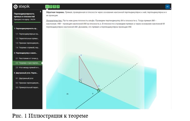 Разработан онлайн-курс для изучения учащихся 10 класса раздела: «Перпендикулярность прямых и плоскостей» на основе платформы Stepik. Курс состоит из теоретического материала, который сопровождается иллюстрациями, выполненными в программе GeoGebra, и тестов по темам. Курс состоит из трех тем: