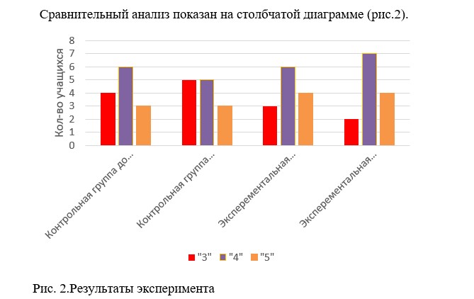 На этапе констатирующего эксперимента был проведен тест входного характера, который представлял собой задания на выявление знаний учащихся предыдущей темы. В течение месяца первая группа проходила обучение исключительно в традиционной форме, а вторая - дополнительно изучала темы по платформе Stepik. В конце эксперимента был проведен контрольный тест для выявления результатов. После этого был зафиксирован следующий результат: учащиеся второй группы выполнили работу более успешно, улучшив свои результаты.